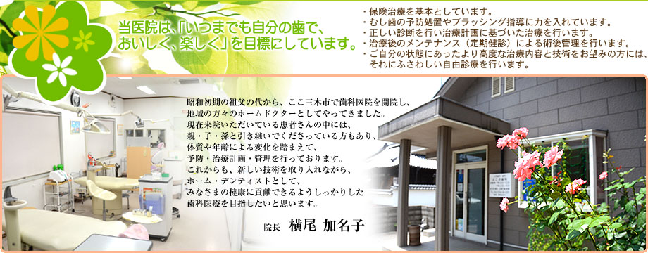 兵庫県三木市のよこお歯科では、「いつまでも自分の歯で、おいしく、楽しく」を目標にしています。
